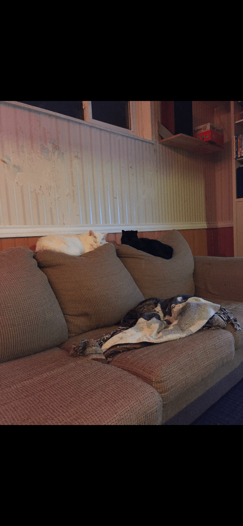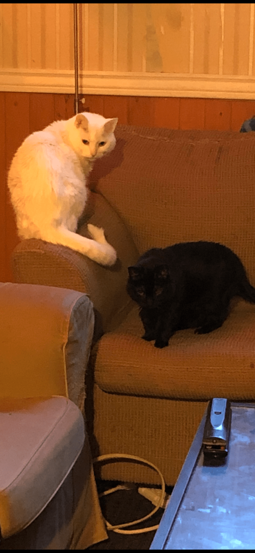 Poco is the black cat, and Herb is the white one. About 5 months ago Herb became very sick very suddenly, and at 13 years old we made the painful decision to euthanize him as he was basically in organ failure. I had a weird relationship with Herb. He was skittish around me when he was younger but in the last year or so of his life he started chilling with me more often and calmly. I came to the realization that he had been afraid of my mood. My post-shift disposition clearly made a larger impression than my day off one did, and as I gradually stopped having down days altogether he was more than acutely aware and generally steered clear. In hindsight Herb was my canary. He knew I was sick.